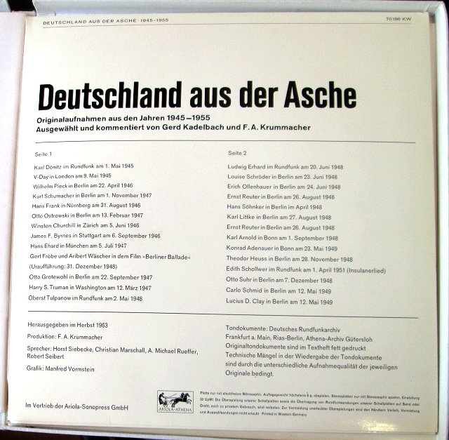 The 2 vinyl records have original speeches by leaders after the WWII who discussed the repair of the German country. Included is a booklet with the transscripts of the speeches. Everything in the German language.